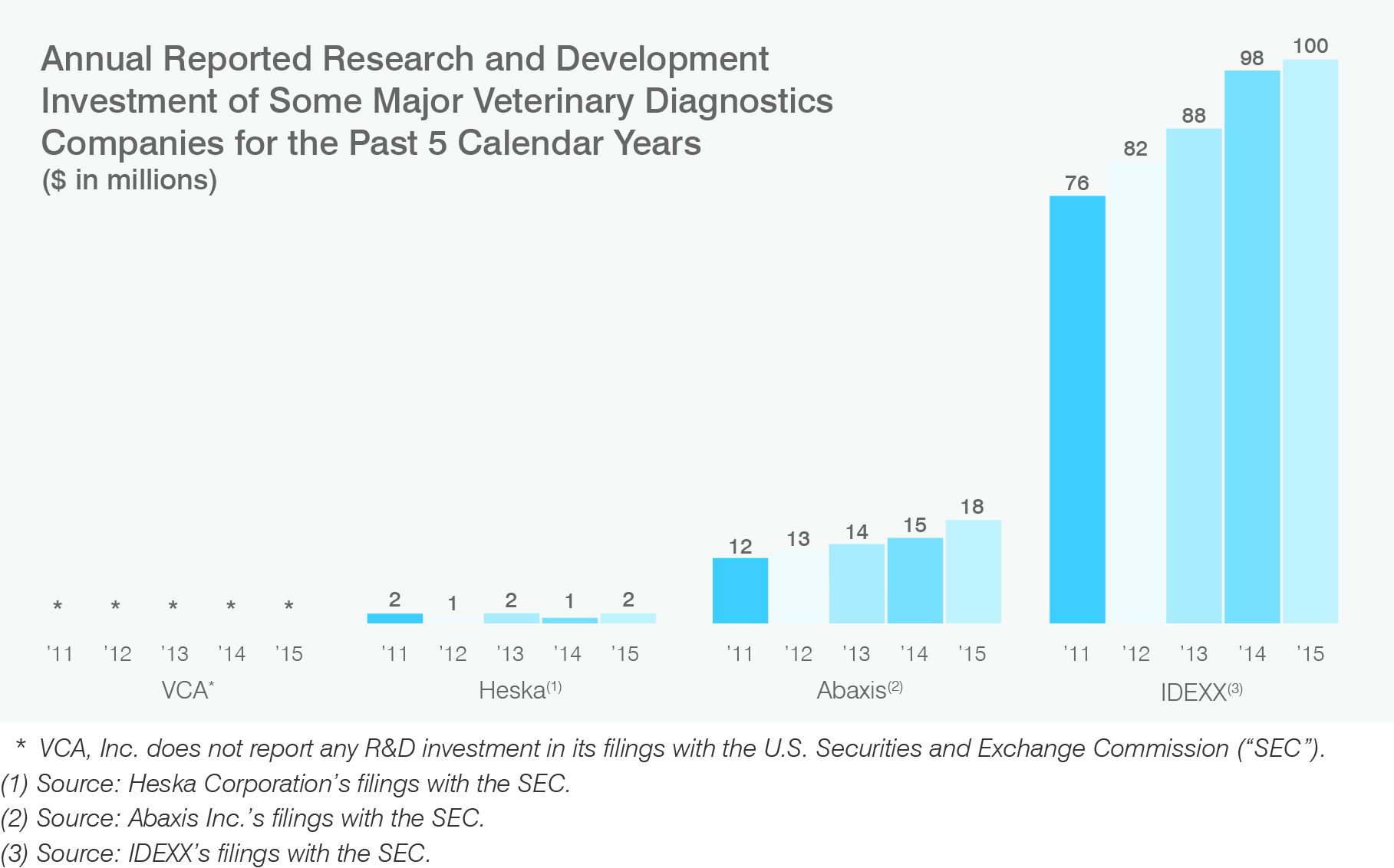 We believe that intelligent, disciplined innovation, fostered by a culture that supports and rewards an entrepreneurial spirit, is fundamental to our success. Through our close connections to our veterinarian customers, and our significant, industry-leading, annual investments in research and development (R&D), we are able to offer innovative solutions that enable veterinary care providers to practice advanced medical care, demonstrate the value of diagnostics to pet owners and better manage their veterinary practices.