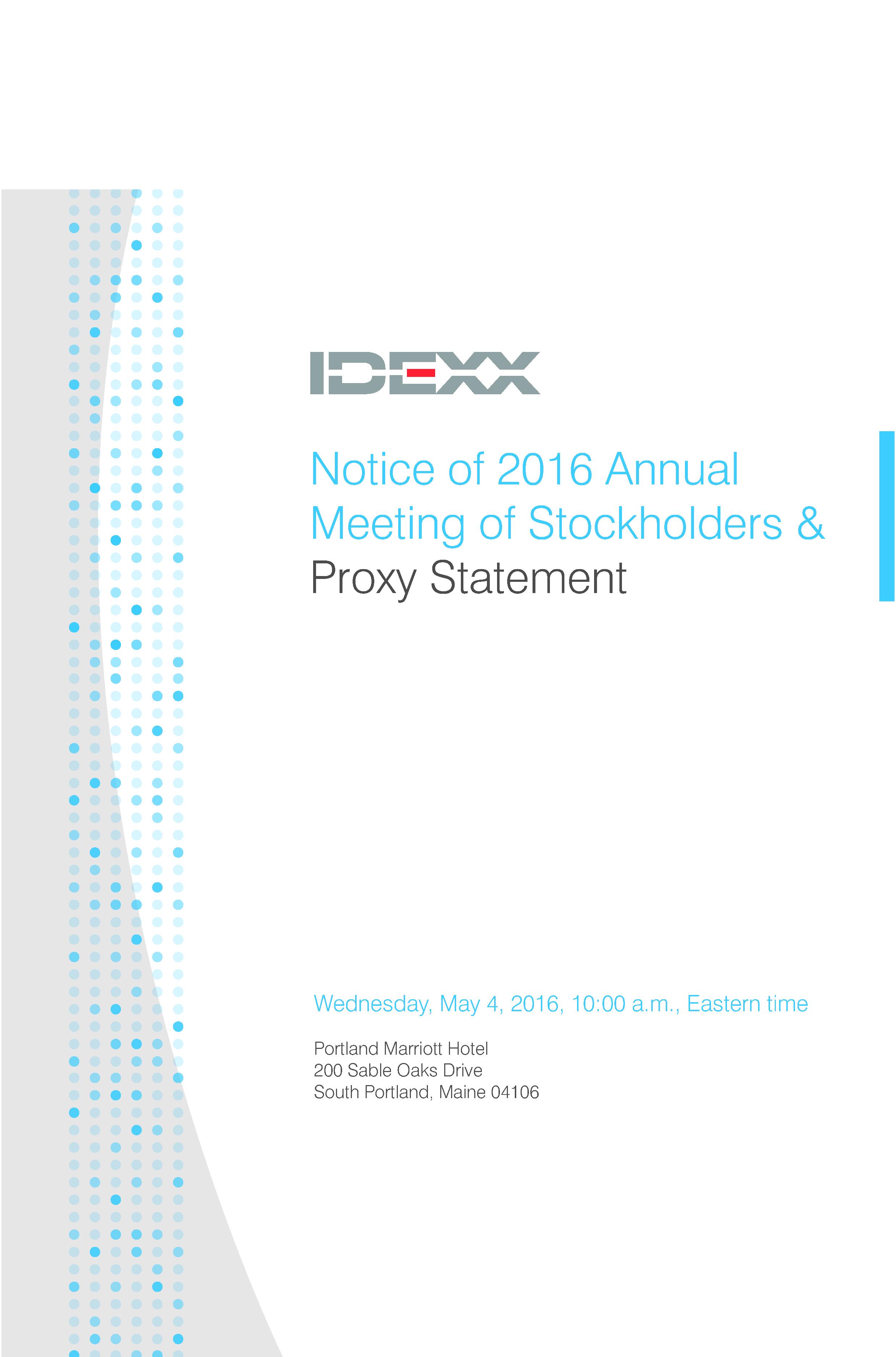 The undersigned, revoking all prior proxies, hereby appoint(s) Jonathan W. Ayers, Brian P. McKeon and Jacqueline L. Studer, and each of them, with full power of substitution, as proxies to represent and vote, as designated herein, all shares of Common Stock of IDEXX Laboratories, Inc. (the "Company") which the undersigned would be entitled to vote if personally present at the 2016 Annual Meeting to be held at the Portland Marriott Hotel, 200 Sable Oaks Drive, South Portland, Maine 04016, on Wednesday, May 4, 2016 at 10:00 a.m., Eastern time, and at any adjournment thereof.