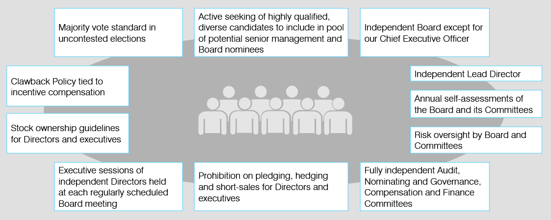 We believe our strong governance and executive compensation practices support long-term stockholder value. A more comprehensive discussion of our governance and executive compensation practices can be found beginning on pages 21 and 42, respectively.