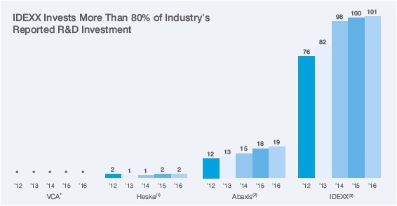 Intelligent, disciplined innovation, fostered by a culture that supports and rewards an entrepreneurial spirit, is fundamental to our success and supports the growth of our global leadership positions in the market segments we serve. Through our close connections to our veterinarian customers, our industry-leading investments in research and development (R&D) and our refined R&D and new product development capability gained through our cumulative experience over several decades, we are able to offer unique, proprietary solutions that enable veterinary care providers to practice advanced medical care, demonstrate the value of diagnostics to pet owners and better manage their veterinary practices. Our R&D investment represents more than 80% of the veterinary diagnostics industry’s R&D investment: