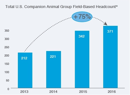 After successfully implementing our all-direct domestic strategy in 2014 and 2015, we have continued to invest in the U.S commercial organization–expanding and increasing our capabilities in serving our U.S. veterinarian customers. Over the last three years, our U.S. CAG field-based professional staffing has grown 75%: