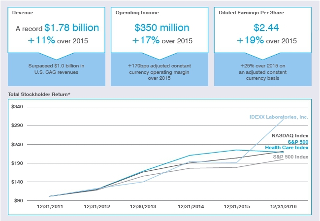 We completed an exceptional year at IDEXX in 2016 and enter 2017 with tremendous momentum, continuing to drive the flywheel of enduring growth that characterizes the IDEXX business model. In early 2017 we also received significant recognition of our success as a publicly traded company: IDEXX was added to both the S&P 500, the premier benchmark for large-cap U.S. equities, as well as the NASDAQ-100 Index, which includes the 100 largest non-financial NASDAQ-listed companies based on market capitalization.