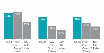 IDEXX was added to the S&P 500® and NASDAQ-100® stock indices in the first quarter of 2017 – a recognition of our success and growth as a publicly traded company. Forbes also named IDEXX as one of America’s Most Trustworthy Companies and one of the World’s Most Innovative Companies in 2017. Our 2017 financial performance reflected 11% revenue growth over the prior year, driven by 10% organic revenue growth, operating margin expansion of 130 basis points and growth of diluted earnings per share (“EPS”) of 20% (or comparable constant currency EPS growth of 21%).1 Creation of long-term shareholder value is reflected in the 22% compound annual growth rate of our stock price over the past 15 years. |