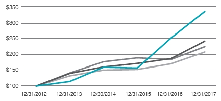 During the five-year period ended on December 31, 2017, we allocated $2.0 billion to repurchase 26% of our outstanding shares at an average price of $70 per share.7 Our disciplined approach to capital allocation resulted in a 42% after-tax return on invested capital, excluding cash and investments, in 2017, reinforcing the attractiveness of our business strategy and focus.